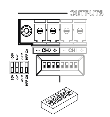 Driveflex amplifiers can be configured for 70V or 100V operation, allowing for long cable runs and multiple loudspeakers to be connected to a single channel. When using 70/100V mode, the rear-panel DIP switch for each relevant channel must be set to the 70V or 100V position and the hardware high-pass filter engaged for that channel. An example 70V channel configuration is shown below: